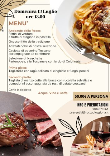 A seguire, la tagliatella con ragù delicato di cinghiale e funghi porcini e la tagliata di manzo alla brace con rucoletta selvatica e rostì croccanti: un equilibrio perfetto tra sapori intensi e profumi estivi.